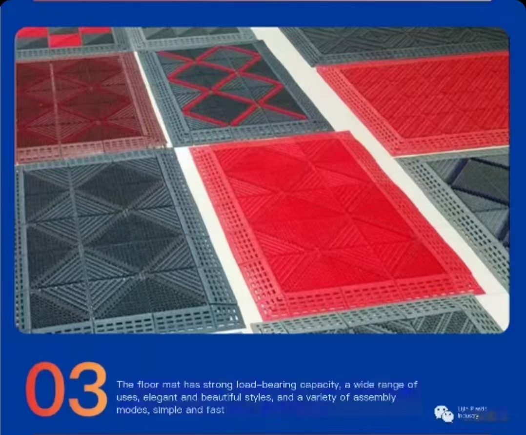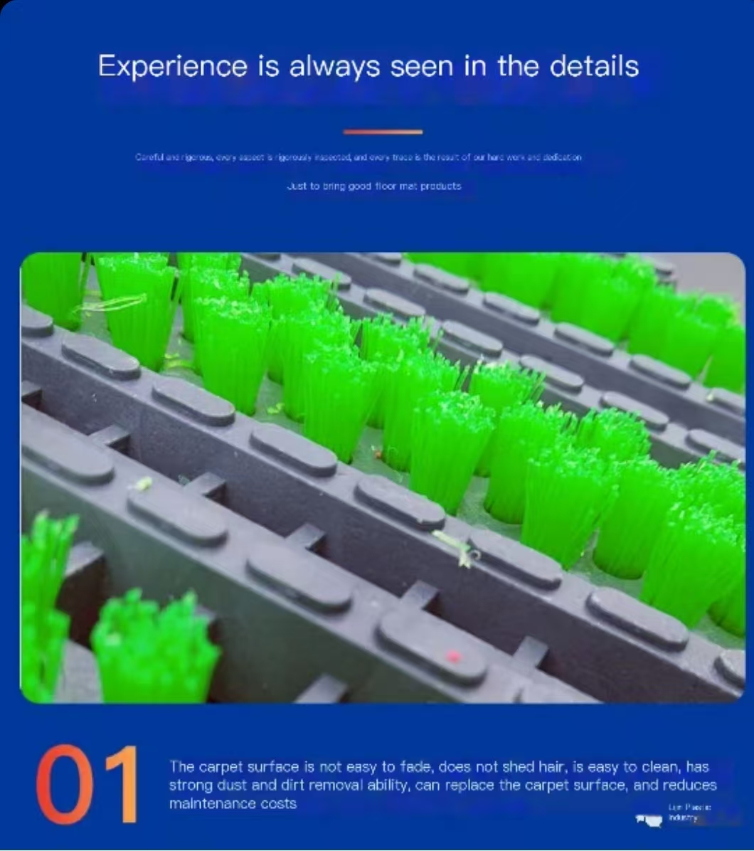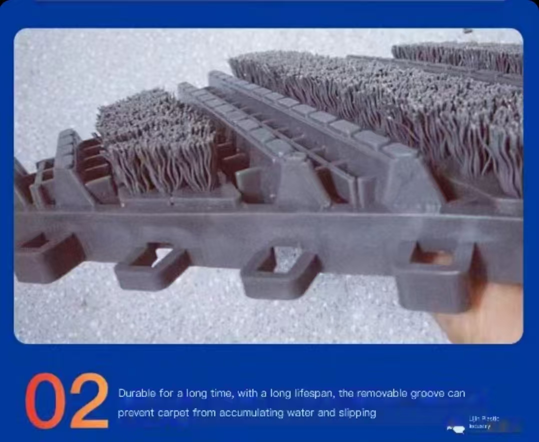 A mat product that has three dust removal structure functions of grass tip, shovel blade and brush. It is often used outside the hallway to scrape the mud and sand on the soles of pedestrians' shoes and prevent slipping. The product is generally designed as a module, combined use, and unlimited splicing. The three-in-one mat is not limited by the reserved well position of the building, and can be laid freely, so it is more convenient to use. At the same time, because it is often a modular structure, it is easier to install and disassemble. Partial damage and aging, can also be partially replaced, no need to replace the whole mat, so it also has flexible use functions and economical and practical characteristics.